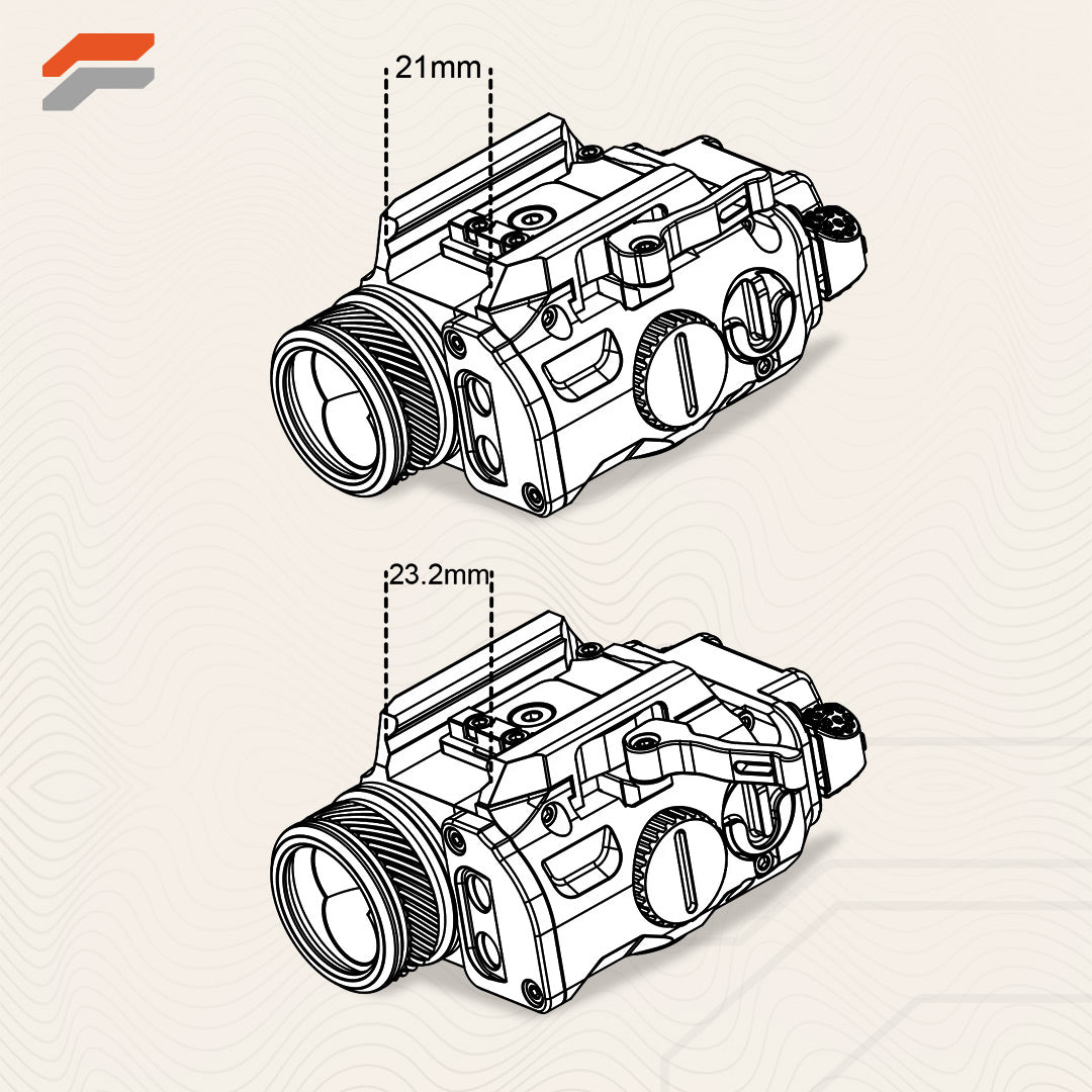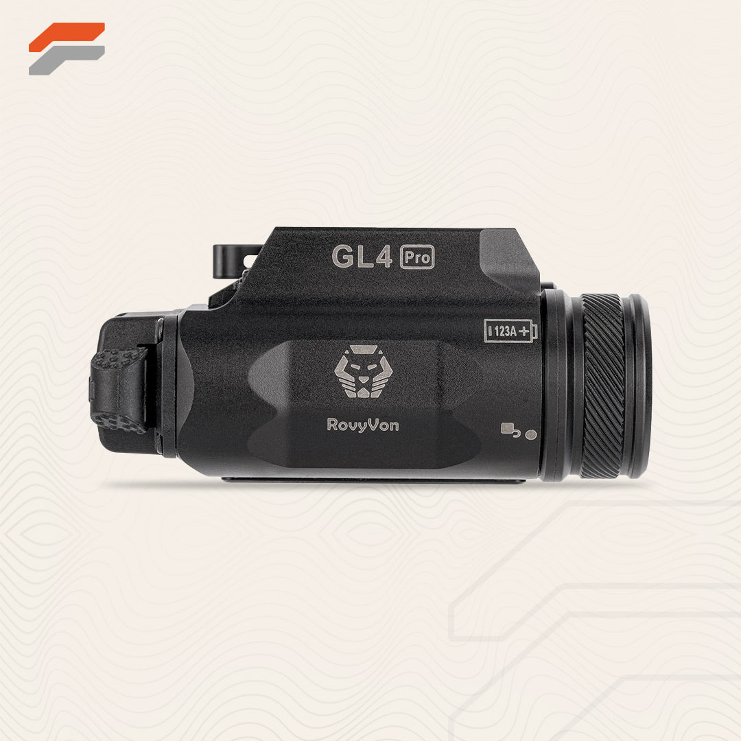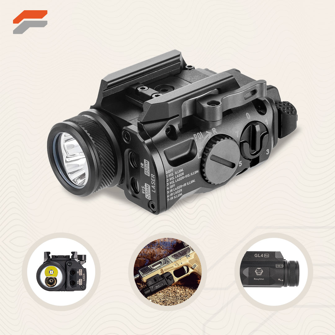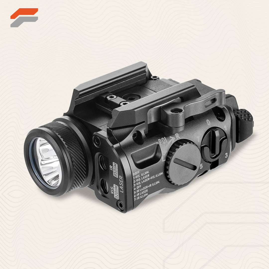 The FS9 GL4 Rail-Mounted Light provides four distinct lighting sources: visible white light (400 lumens), IR illuminator (300mW), green laser (520nm, <5mW), and an additional IR light source (<0.7mW).