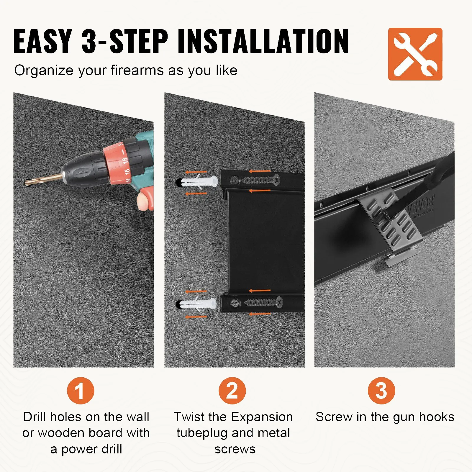 3-Step Installation: Easy and quick setup! Our user-friendly installation allows for hassle-free DIY assembly. Stainless steel screws firmly secure the indoor gun rack to your wall, ensuring stability and safety. Additionally, plastic washers on the screws prevent loosening for a stable connection.