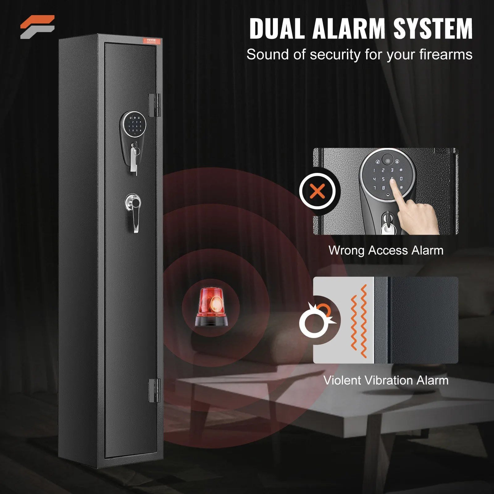Alarm System & Silent Mode: Our gun safe for rifles includes an advanced alarm system that triggers a 30-second alarm if an incorrect password is entered five times consecutively or if it detects a violent impact. For discreet access, activate silent mode by pressing 11#.